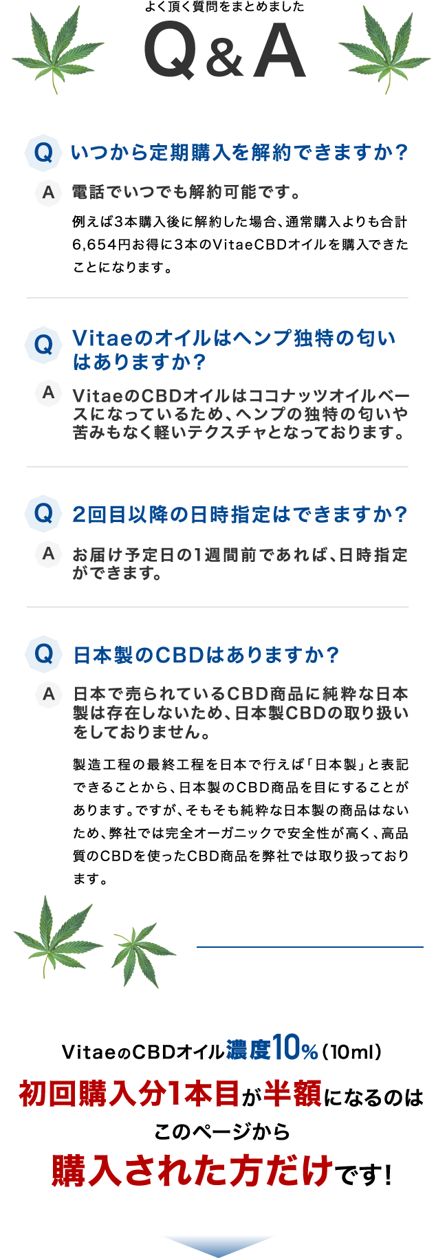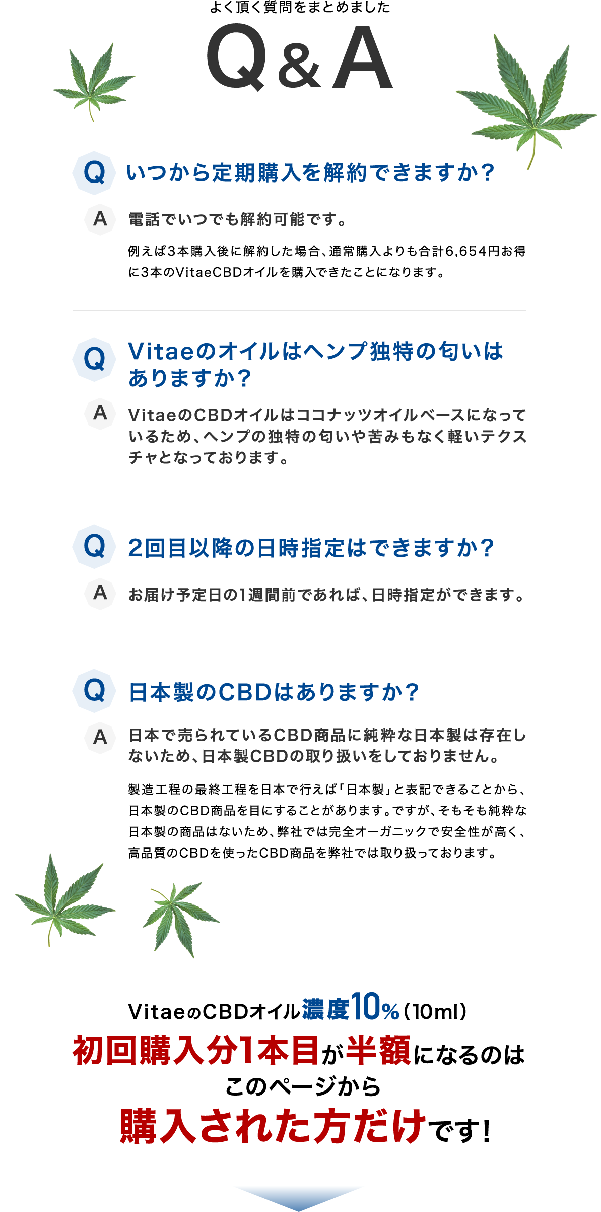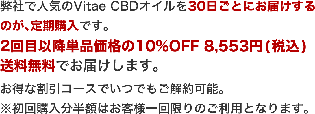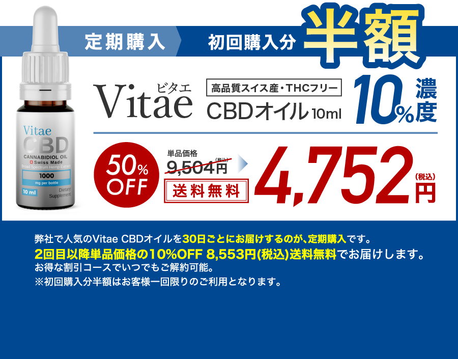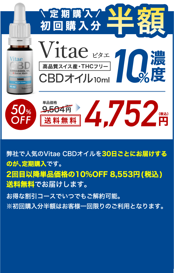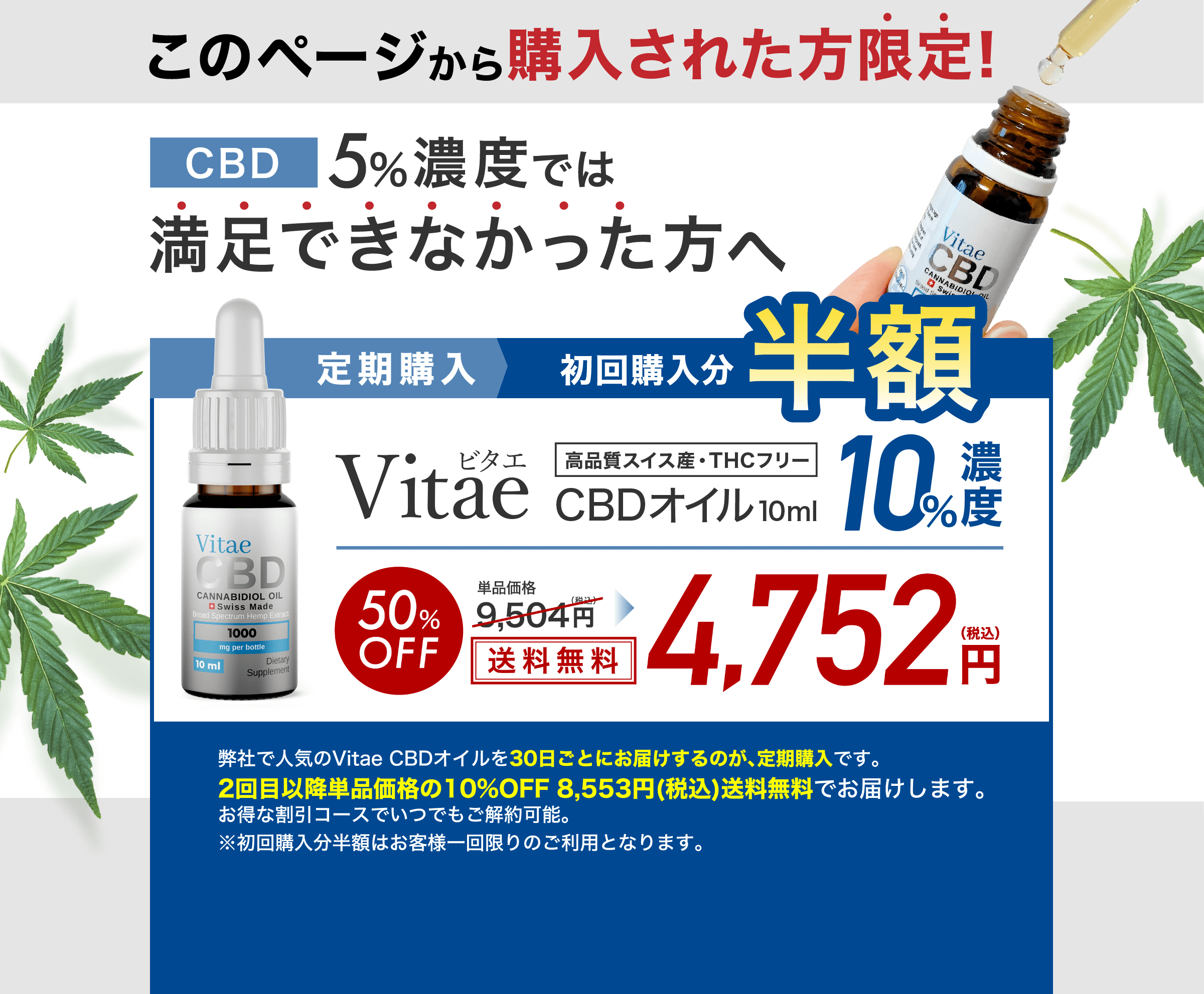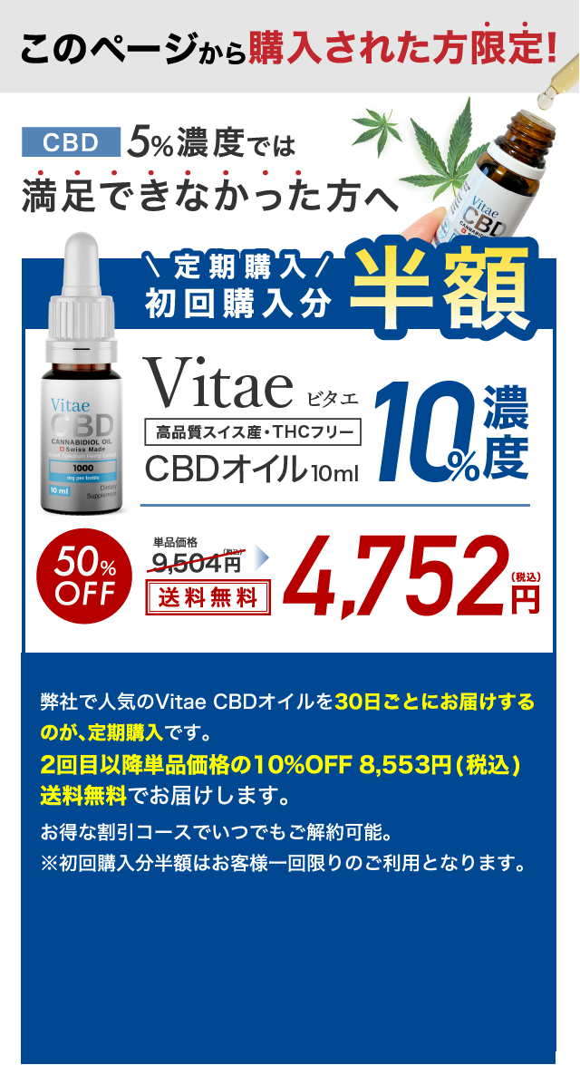 CBD5%濃度を使っていましたが、仕事が忙しいときなど効果に満足できないことが多く、安全で値段も高すぎないCBD10%のオイルを試すことにしました。CBD5%よりも効果を感じやすく、身体が緩むので夜眠る前に使っています。まずは、試しに購入してみましたが、定期購入することにしました。